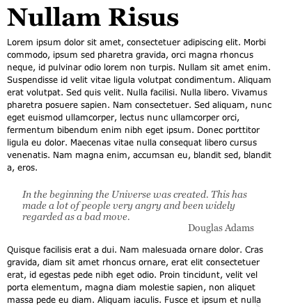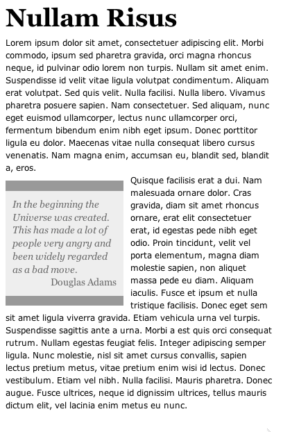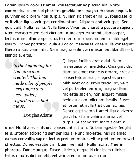 Here, we've floated the blockquote to the left, added some margins (so that the body text isn't bumping up next to the pullquote), styled and colored the font, colored the quote box, and added large, dark-gray top and bottom borders. Phew!